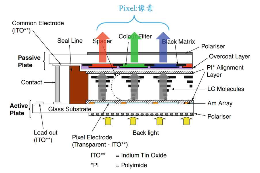 En olgun ve yaygın olarak benimsenen ekran çözümü olan LCD (Sıvı Kristal Ekran), aşağıdaki temel prensibe göre çalışır: bir arka ışık ünitesi, üç ana rengi üretmek için RGB renk filtrelerine ulaşmadan önce polarizörlerden ve sıvı kristal katmandan geçen beyaz ışık yayar. Son olarak, her pikselin parlaklığı, uygulanan voltaj aracılığıyla sıvı kristal moleküllerin yönelimi kontrol edilerek ayarlanır. Bu süreç birkaç temel bileşenin koordineli çalışmasına dayanır: arka ışık ünitesi, TFT dizisi, sıvı kristal katman ve renk filtreleri.