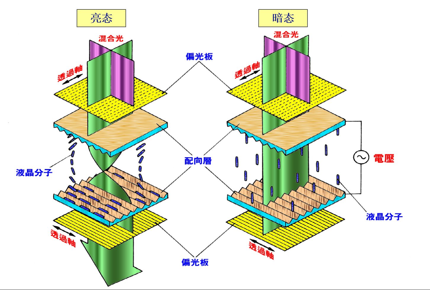 Parlak durumda (görüntülenmeyen durum), sıvı kristal molekülleri düzenli 90 derecelik bükülmüş bir düzenlemeyi korur. Gelen ışık, ön polarizörün iletim ekseninden geçtikten sonra polarize olur. Bu polarize ışık sıvı kristal katmandan geçerken, polarizasyon yönü moleküler büküm yapısıyla birlikte 90 derece döner, arka polarizörün optik ekseniyle hizalanır ve parlak durumu oluşturmak için iletir.